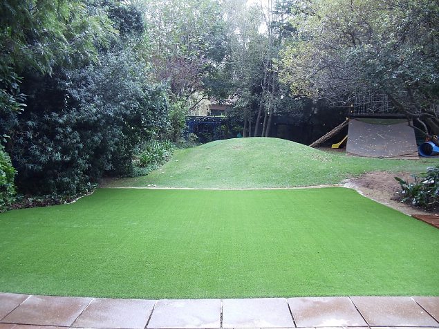 Kombineeritud õu naturaalse muruga ja esiplaanil ühtlasema.. | Tehismuru Lõuna-Aafrikas Kunstmuru paigaldamisel pööratakse tähelepanu alusmaterjalide ohutusele, et laste mänguväljak oleks turvalisem ning sellel mängimine ohutum.
